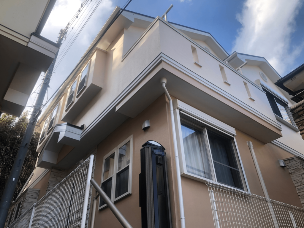 施工後:パルフェTOPのツヤ感が引き立ち、外壁が新築同様に生まれ変わった。汚れが付きにくく、雨水で自然に洗い流されるケースも増えたとのこと。施主は「前よりこまめに掃除しなくても、外観がキレイに保てている」と満足。
